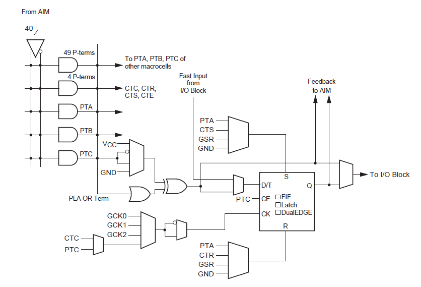 以上是Xilinx的CoolRunner-II的架构图,其由多个功能块(FB)组成,高级互联矩阵(AIM)将各个功能块连接起来,FB由可编程逻辑阵列(PLA)和16个宏单元组成,而其实PLA其实是两级与或门,而宏单元的结构如下: