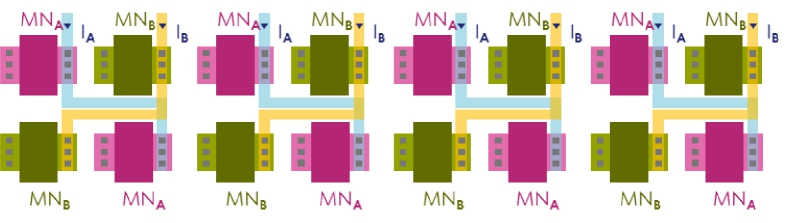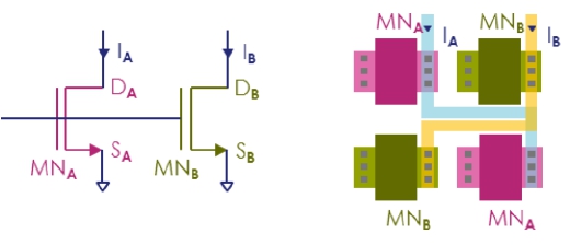 在上面的示意图中,尽管两个晶体管A和B在设计上是相同的,但在实践中它们始终具有略微不同的物理特征, 如作为阈值电压(VT),漏源电流(IDS)或漏源电阻(RDSON)