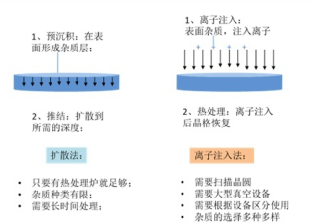掺杂是将特定量的杂质通过薄膜开口引入晶圆表层的工艺过程,其本质是在晶圆上制作P、N结。它有两种工艺方法:热扩散(thermal diffusion)和离子注入(ion implantation)。热扩散是在1000℃左右的高温下发生的反应,气态下的掺杂原子通过扩散化学反应迁移到暴露的晶圆表面,形成一层薄膜,在芯片应用中,热扩散也称为固态扩散,因为晶圆材料是固态的。扩散掺杂是一个化反应过程,由物理规律支配杂质的扩散运动。离子注入是一个物理过程,在离子源的一端,掺杂体原子被离子化(带有一定的电荷),被电场加到超高速,穿过晶圆表面,注入到晶圆表层中。