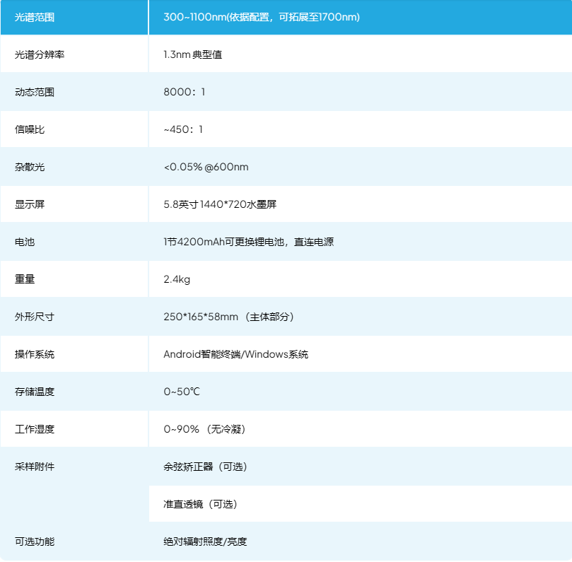 FS1100是一款专用于地表特征光谱测量的手持式地物光谱仪,可实现快速、准确、无损且非接触式光谱测量。FS1100地物光谱仪的性价比高、体积小、重量轻、续能力强,可满足野外应用的测试需求。适用于遥感科学、植物生长检测、土壤与水质分析、林业与生态测量研究等应用领域。