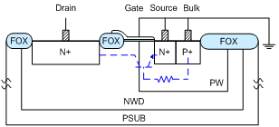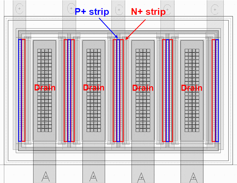 如图1所示为普通GG-nLDMOS的剖面图,其工作原理是利用器件体内的寄生三极管工作,泄放静电流。图2为普通GG-nLDMOS多叉指器件版图实现示意图。