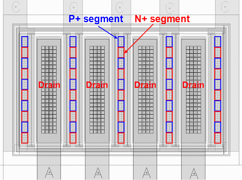 如图3所示为我司开发的BSDOT器件剖面图,其工作原理是同普通LDMOS,通过改进源漏极布局形式,源漏极分段长度优化,改变泄放路径电阻,提高器件静电泄放潜能。图4为改进后BSDOT器件版图实现示意图。