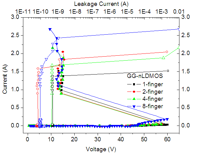 高压功率集成电路是半导体产业的一个重要分支,在汽车电子、电源管理、高压驱动、航天航空、武器装备里有着广泛的应用。LDMOS是功率IC常用的片上静电自防护器件,其内部存在静电泄放电流非均匀分布的问题。我司开发采用的BSDOT结构,通过TCAD仿真和流片测试验证,有效将原始LDMOS器件的静电防护能力提高一倍以上,达到片上8kV HBM 设计目标。