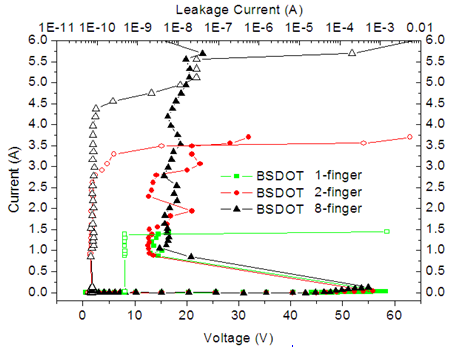 如图5、6所示为普通LDMOS与我司BSDOT的测试曲线对比,我司BSDOT器件在不增加版图实现面积且器件结构简单易行的前提下,有效将多叉指LDMOS器件的静电防护能力提高一倍,实现了4kV、8kV BSDOT器件。