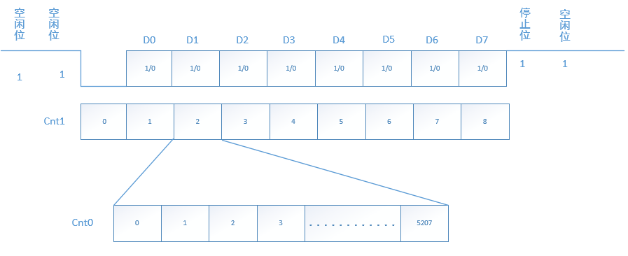 2. 每次上游模块发送数据,都是先发送1位的起始位0,然后发送8位的数据,最后是1位的停止位1。