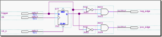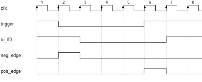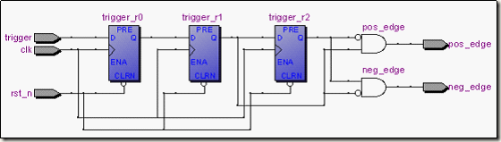 always @(posedgeclk or negedgerst_n)begin if(rst_n==1'b0)begin tri_ff0 <= 0; tri_ff1 <= 0; tri_ff2 <= 0; end else begin tri_ff0 <= trigger ; tri_ff1 <= tri_ff0 ; tri_ff2 <= tri_ff1 ; end end assign neg_edge = tri_ff1==0 && tri_ff2==1; assign pos_edge = tri_ff1==1 && tri_ff2==0; |