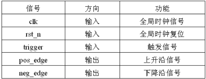 中间信号,trigger连到触发器的信号输入端D,触发器的输出器连的是tri_ff0。将trigger取反,与tri_ff0相与,就得到信号neg_edge,如果neg_edge=1就表示检测到trigger的下降沿。将tri_ff0取反,与trigger相与,就得到信号pos_edge,如果pos_edge=1,就表示检测到trigger的上升沿。 我们来讲解这个原理,信号的波形图如下: