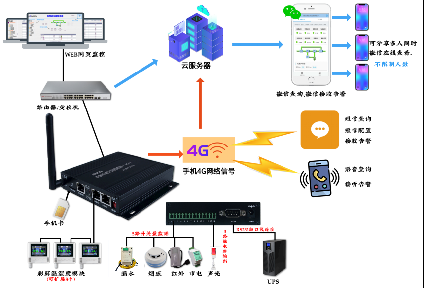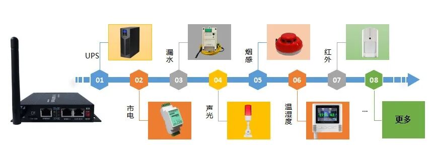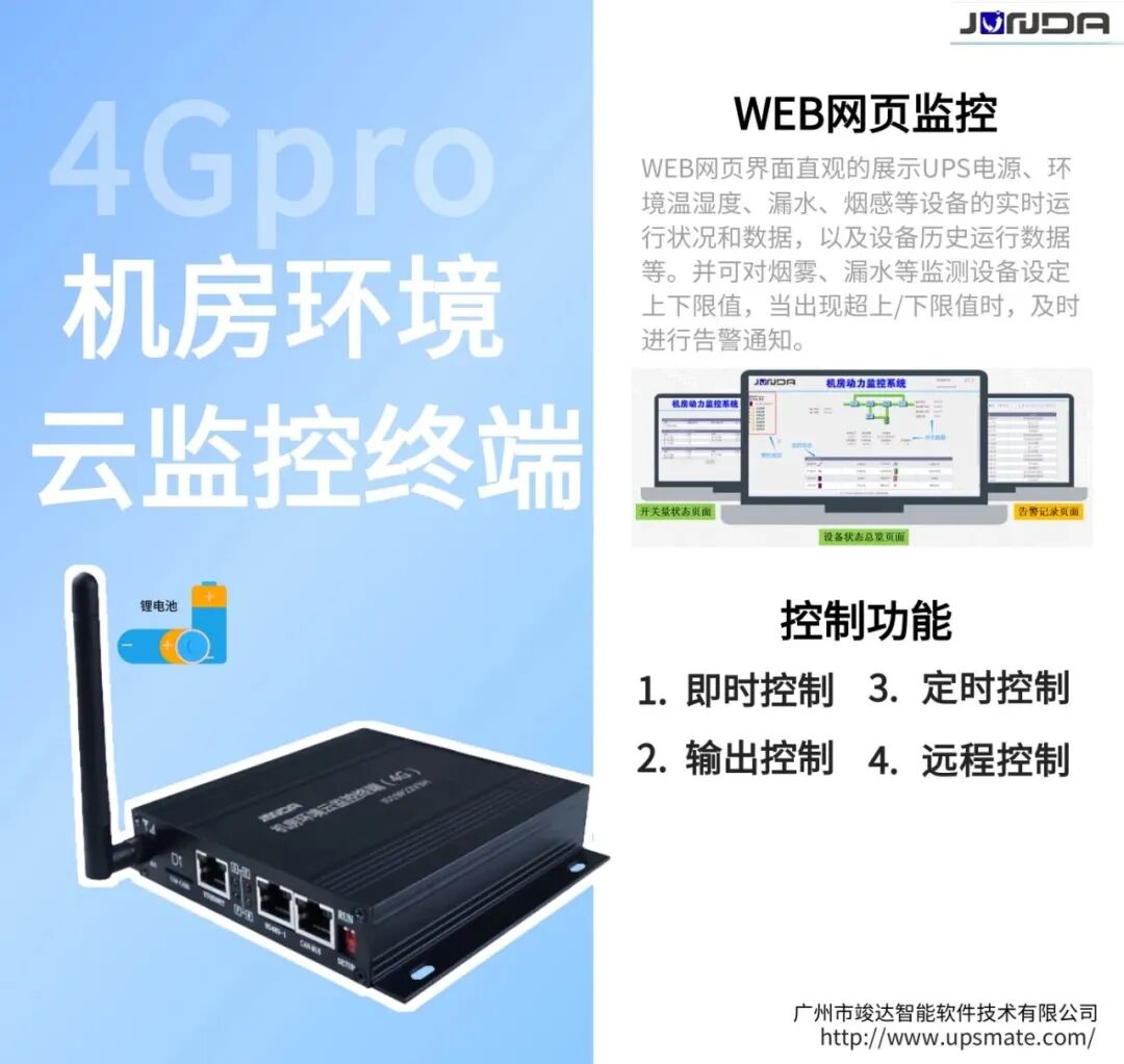 一机多用: 支持1路UPS接入,5路的开关量输入检测,3路的远程控制输出接口,扩展8路温湿度模块监测。实现同时对于UPS、机房温湿度、漏水、烟雾、市电、声光等实时运行状态及告警状态监测。 WEB网页监控: WEB网页界面直观的展示UPS电源、环境温湿度、漏水、烟感等设备的实时运行状况和数据,以及设备历史运行数据等。并可对烟雾、漏水等监测设备设定上下限值,当出现超上/下限值时,及时进行告警通知。 告警及控制功能: 在UPS本身支持远程开/关机的情况下,可通过WEB网页进行设置操作后,可通过WEB网页和短信进行下发控制命令,实现对UPS远程放电测试和UPS远程开/关机。 多选监控告警功能: 可通过WEB网页同时启用短信、语音、微信三种或者启用一、两监控功能,并可配置告警事件和对应的告警接收人。配置部分,也可以通过短信进行配置 更完善的UPS、精密空调、电池巡检等产品配套和技术服务,请在下面评论或留言,竣达技术为您详细解答。